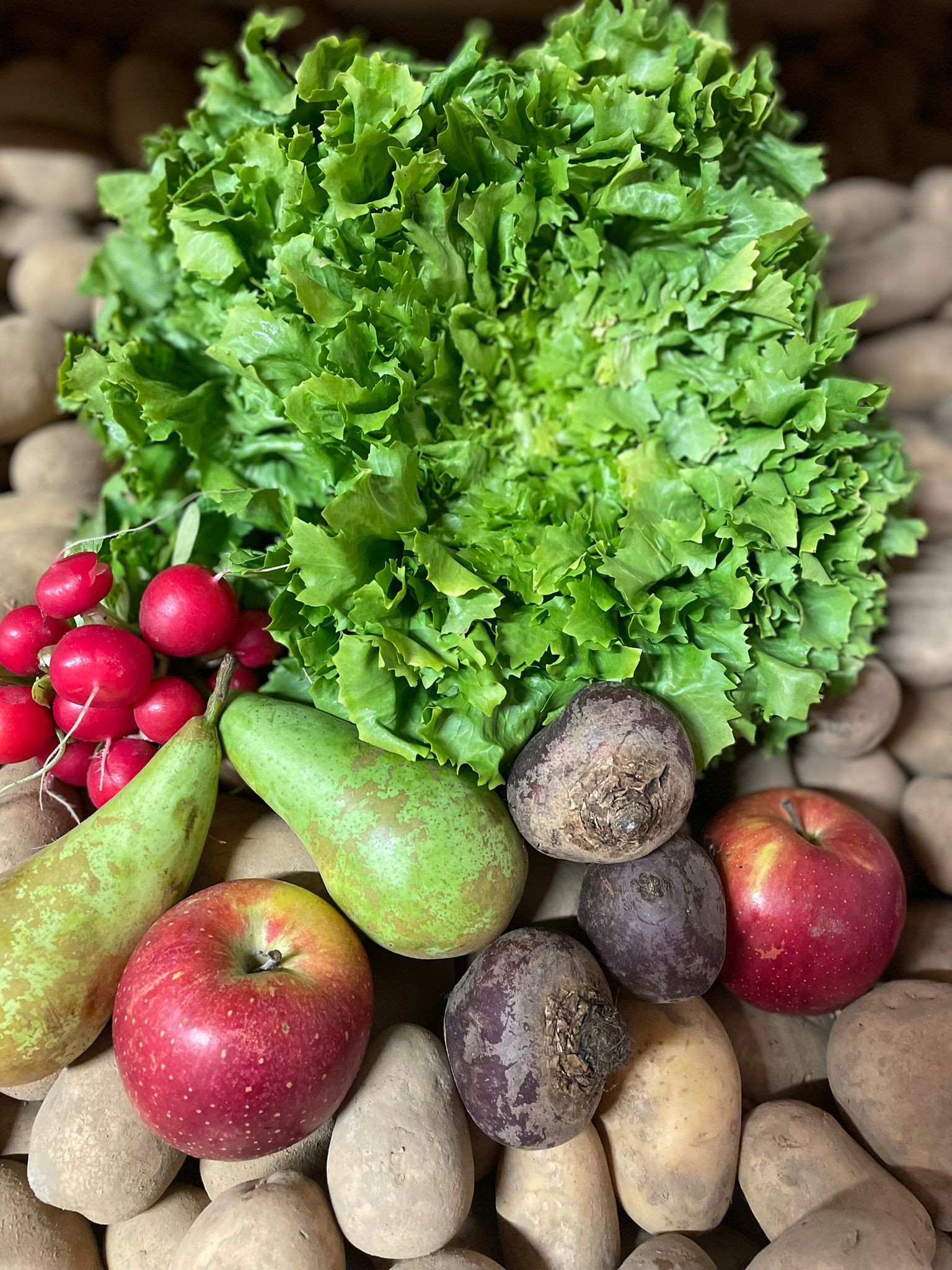 Donnerstag 29.01.2026 1 Endivien 1 Bund Radieschen 3 rote Beete Aus der eigenen Ernte: 2 Äpfel 2 Birnen 1 kg Solara Kartoffel