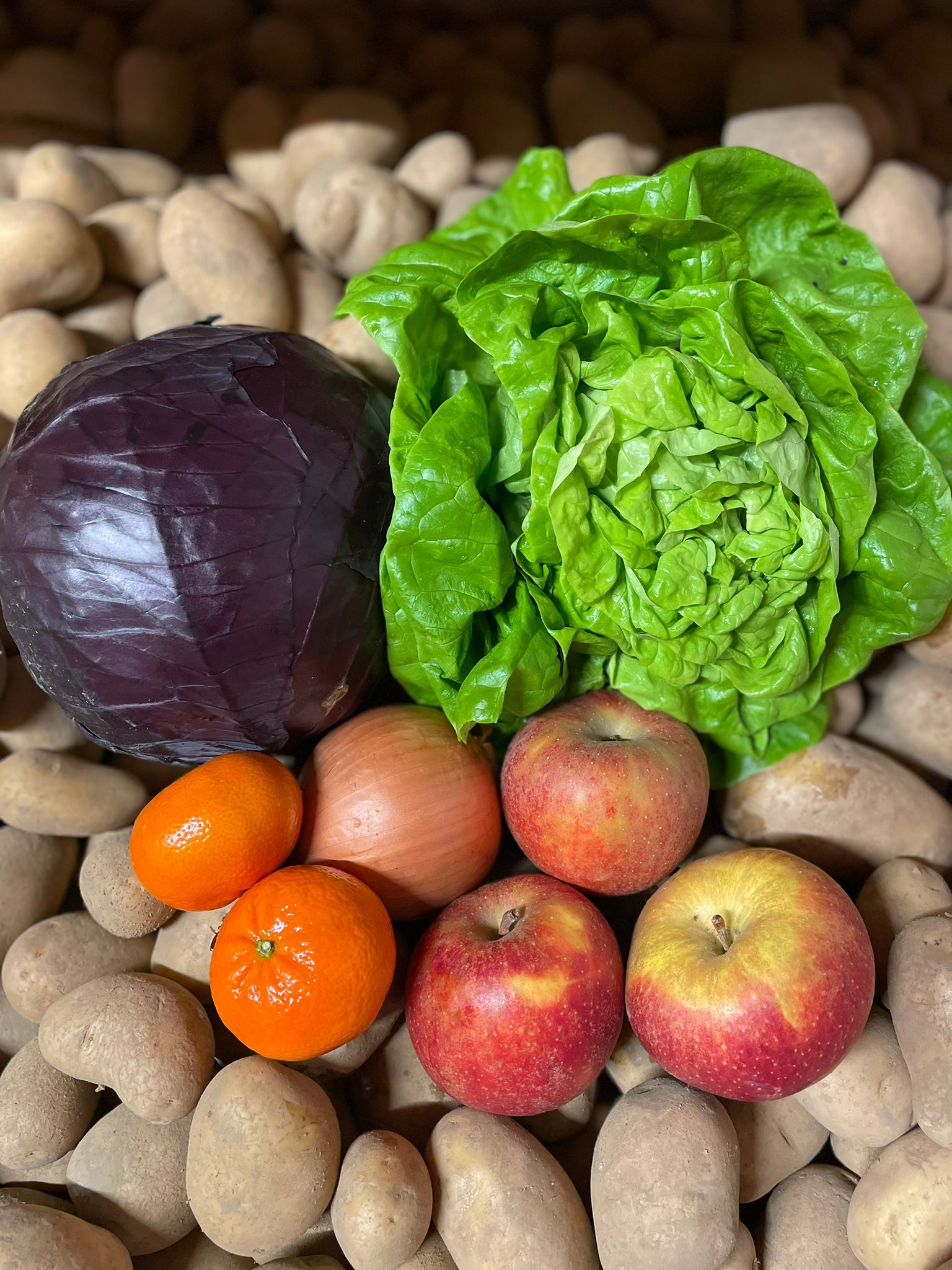 Donnerstag 29.01.2026 1 Rotkohl 1 Gemüsezwiebel 1 Kopfsalat 2 Clementinen Aus der eigenen Ernte: 3 Boskoop Äpfel 1 kg Solara Kartoffel